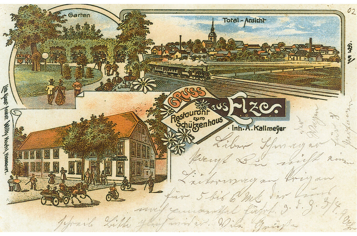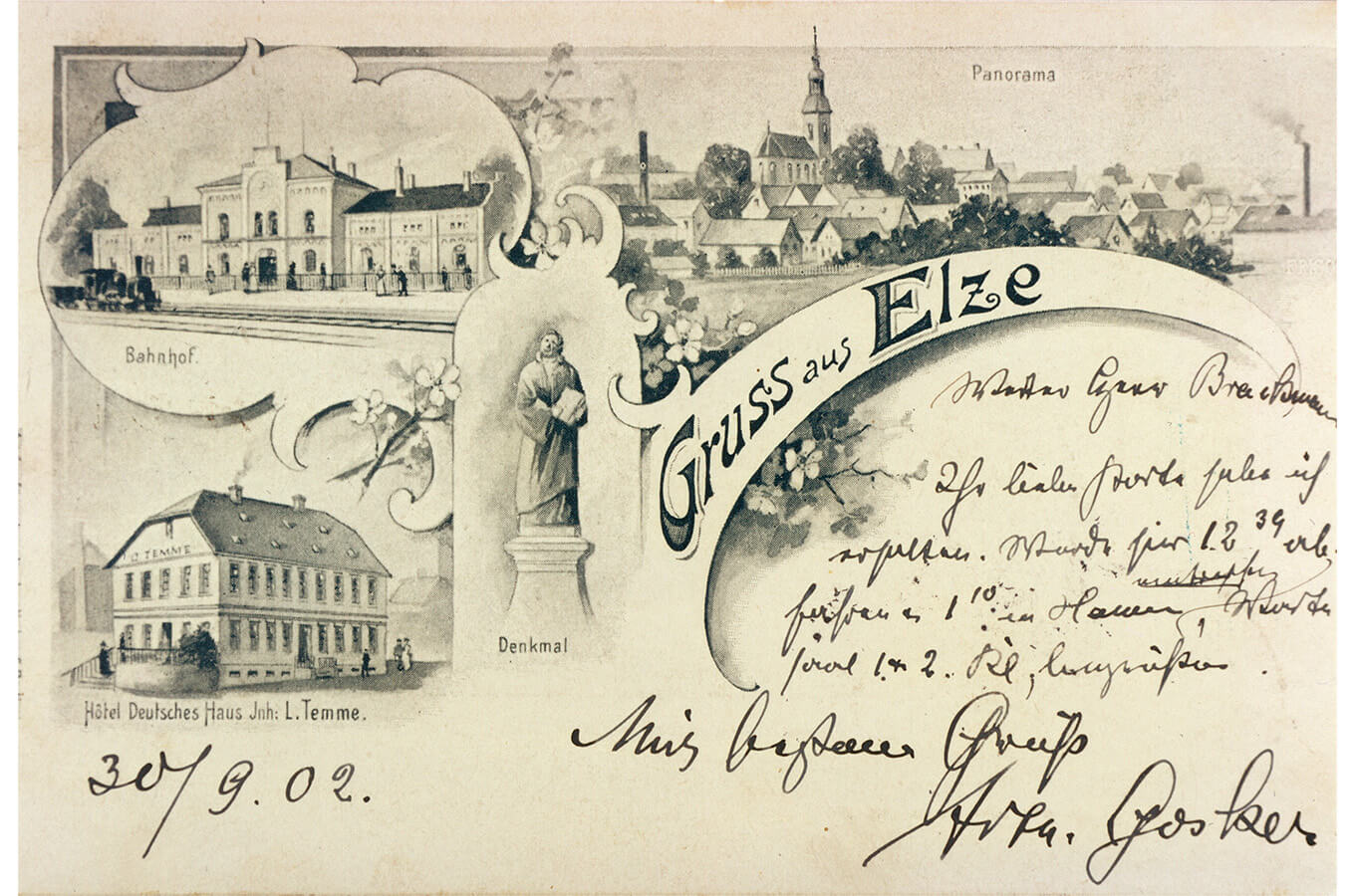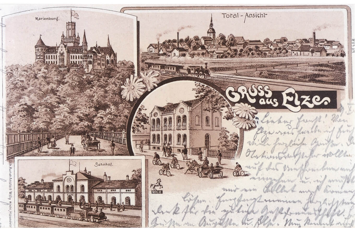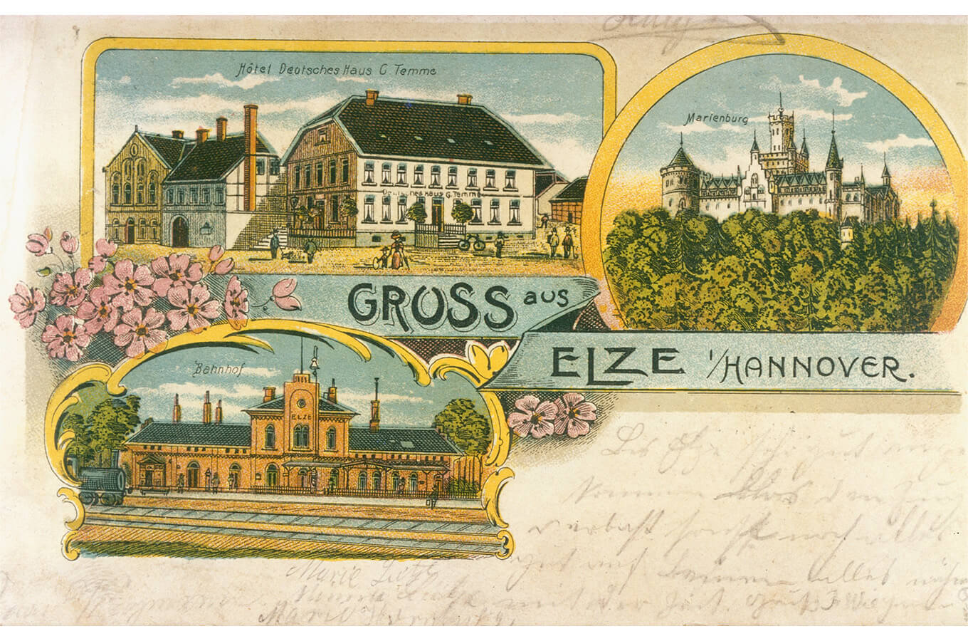 Elzes Nachbarstadt Gronau mit fein gezeichneten Stadtansichten. Die Bahnlinie von Elze nach Gronau wurde im Jahr 1900 eröffnet (und bis 1980 betrieben).