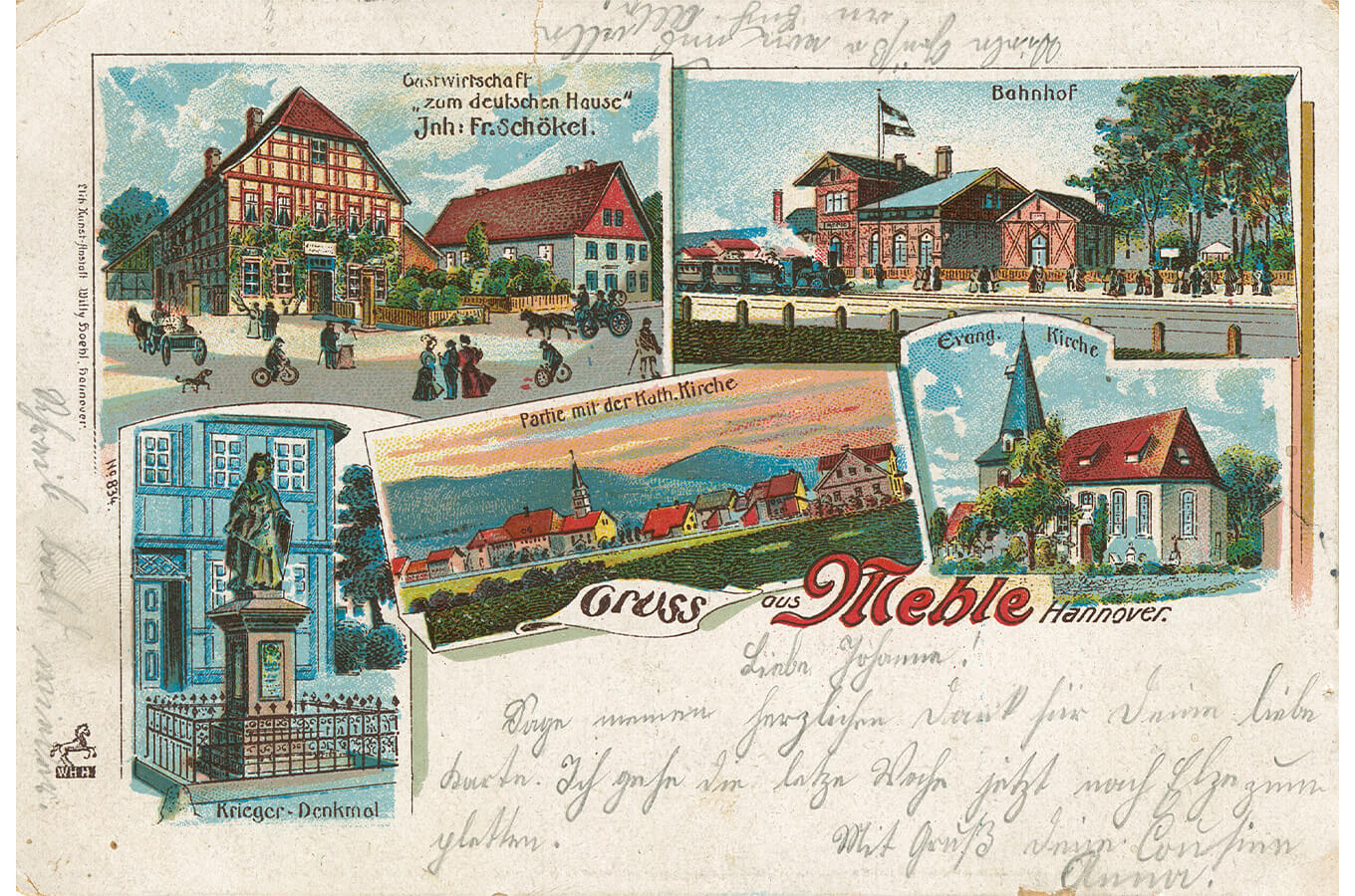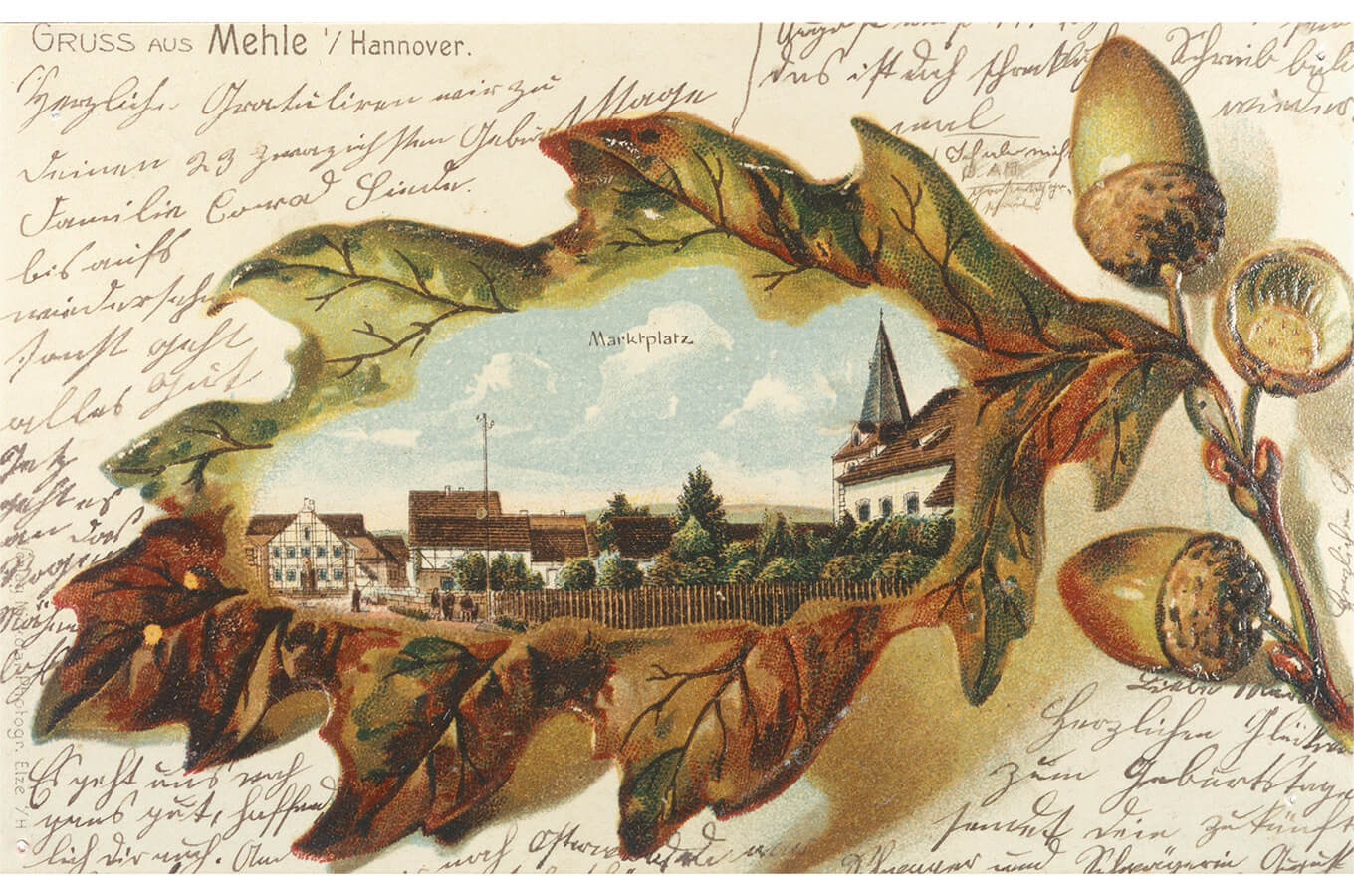 Im ausgehenden 19. Jahrhundert war die Fotografie noch nicht sehr weit entwickelt. Für Abbildungen auf Postkarten haben die Verlage daher gerne kolorierte Lithographien benutzt. Diese einfallsreich gestaltete Karte zeigt das Mehler Ortszentrum.