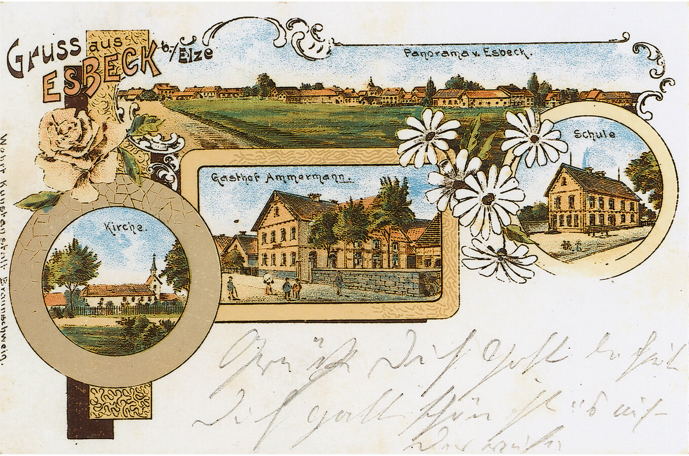 Im Jahr 1900 gibt es von fast allen Ortschaften kolorierte lithographische Postkarten. Auch Esbeck stellt sich mit Sehenswürdigkeiten dar.